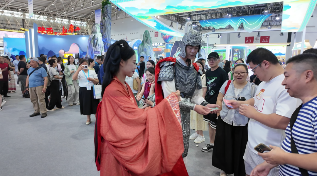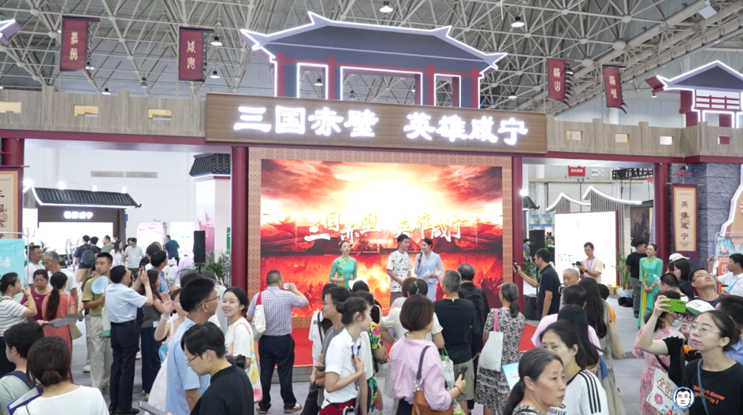 步入展会,咸宁展区凭浓郁“三国气息”吸睛。作为中国古代“以少胜多”七大战役中唯一保存原貌的古战场,咸宁赤壁古战场是文旅核心IP。此次展区紧扣国风热潮,以赤壁谯楼为原型,融入三国人物剪影与温泉元素,兼具历史厚重与现代惬意。