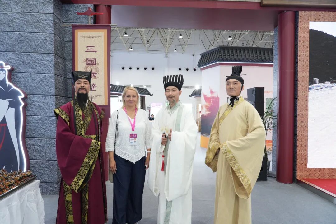 一曲《赤壁新潮》唱响,扮演周瑜、曹操与周瑜的演员身着精致古典服饰走上舞台,刹那间便将观众带入情境之中,现场瞬间响起细碎的惊叹声。演出完毕,不少外国观众争相上台与演员合影。