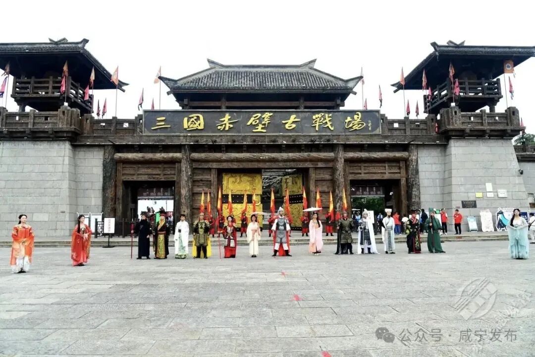 白天,三国赤壁古战场成为文化体验核心打卡地。上午9时,景区正门广场的“开园迎宾”表演伴随战鼓与古风乐曲启幕;神武台汉服秀上,演员衣袂飘飘的身姿吸引游客驻足拍照;三国雕塑园里,刘、关、张“桃园结义”场景表演重现经典誓言,现场掌声不断;陈列馆内,投壶、射箭等汉代竞技项目前,亲子家庭与年轻游客争相参与。