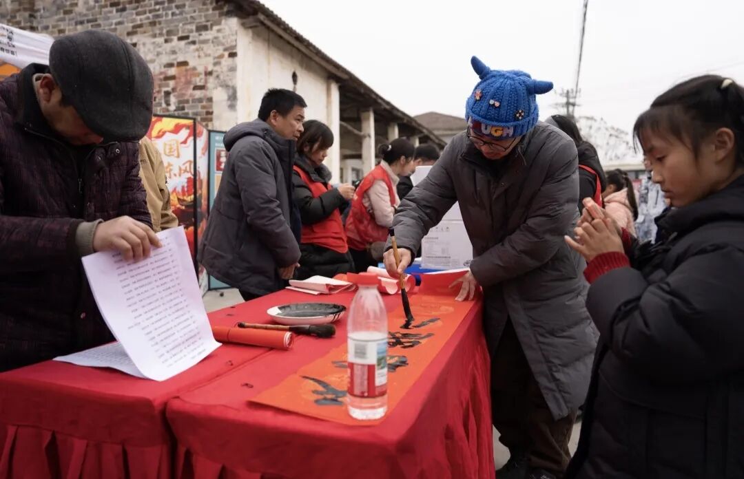 次日,活动转场至咸安区大幕乡常收街道,热度不减。当地的文艺演出同样精彩纷呈,歌舞、戏曲等节目轮番上演,展现出基层文化的活力。 “春联送福” 摊位前依旧排起长龙,书法家们挥毫不断,将吉祥安康的祝愿写入春联,送入百姓家中,延续了传统文化的温情传递。