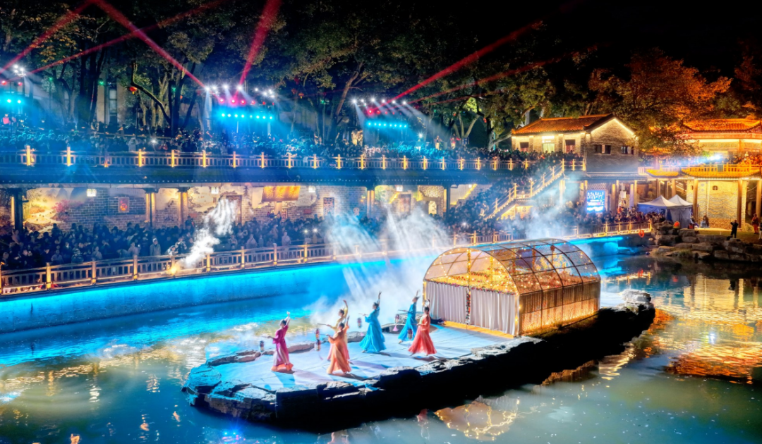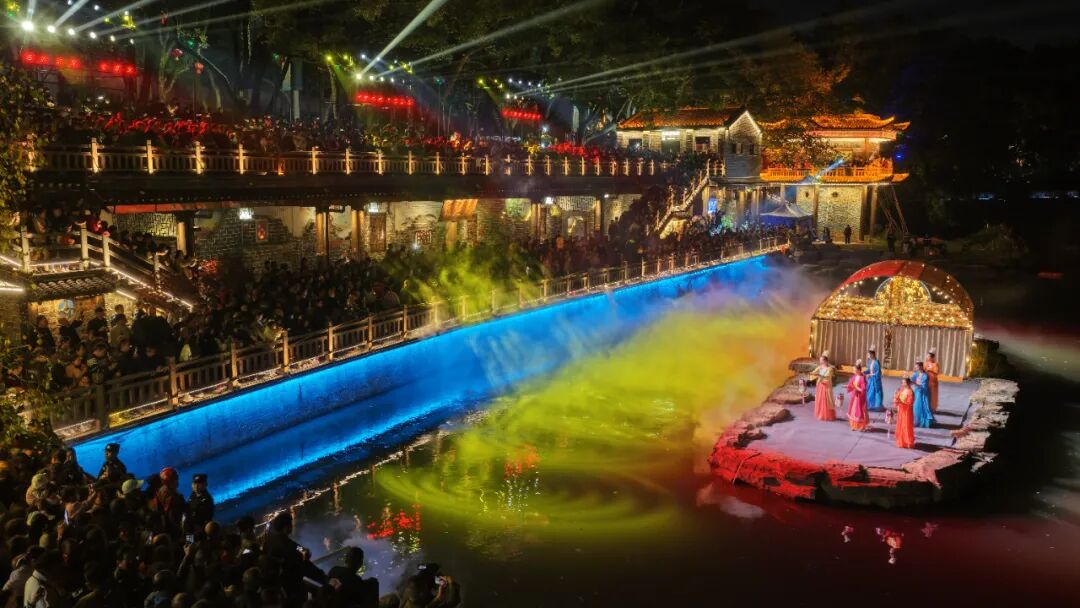 演出以 “冯京回乡省亲” 为主线,40 分钟里,《温泉沸波》的恢弘、《扁舟谣》的婉转、《月亮湾迎客歌》的热情轮番上演,两岸百姓举太平灯迎贵客的场景,将咸宁的温泉特色与民俗风情展现得淋漓尽致。