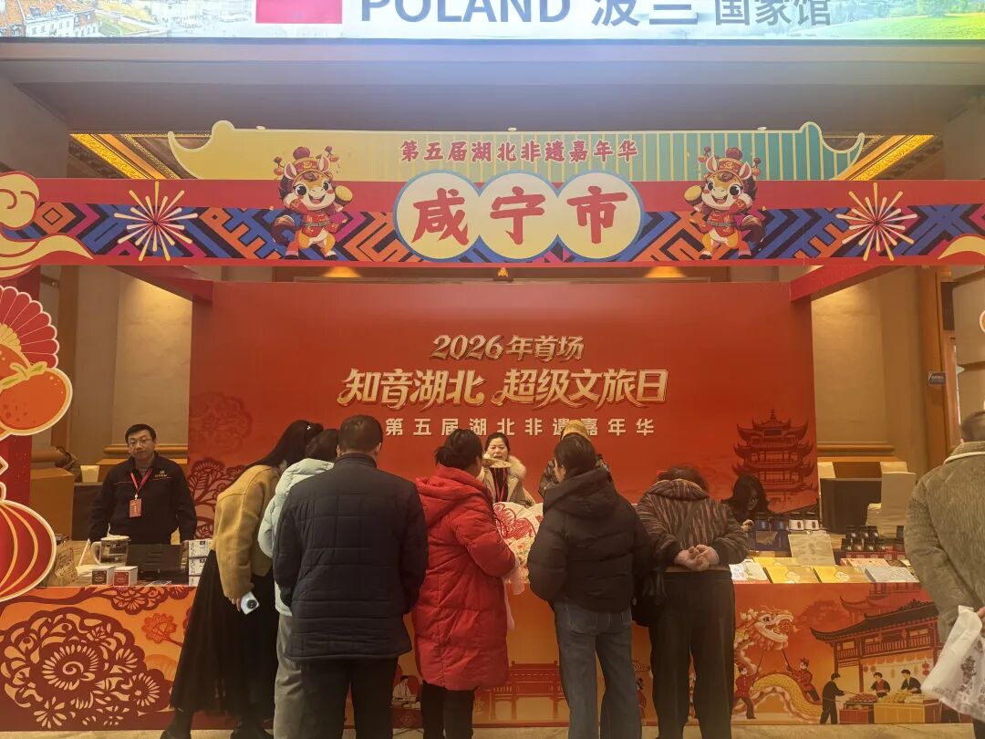 2026年首场“知音湖北·超级文旅日”暨第五届湖北非遗嘉年华在武汉火热启幕,咸宁非遗好物组团亮相,带着鄂南大地的烟火气与匠心魂,在江城年货市场掀起一阵消费热潮,斩获亮眼成绩。